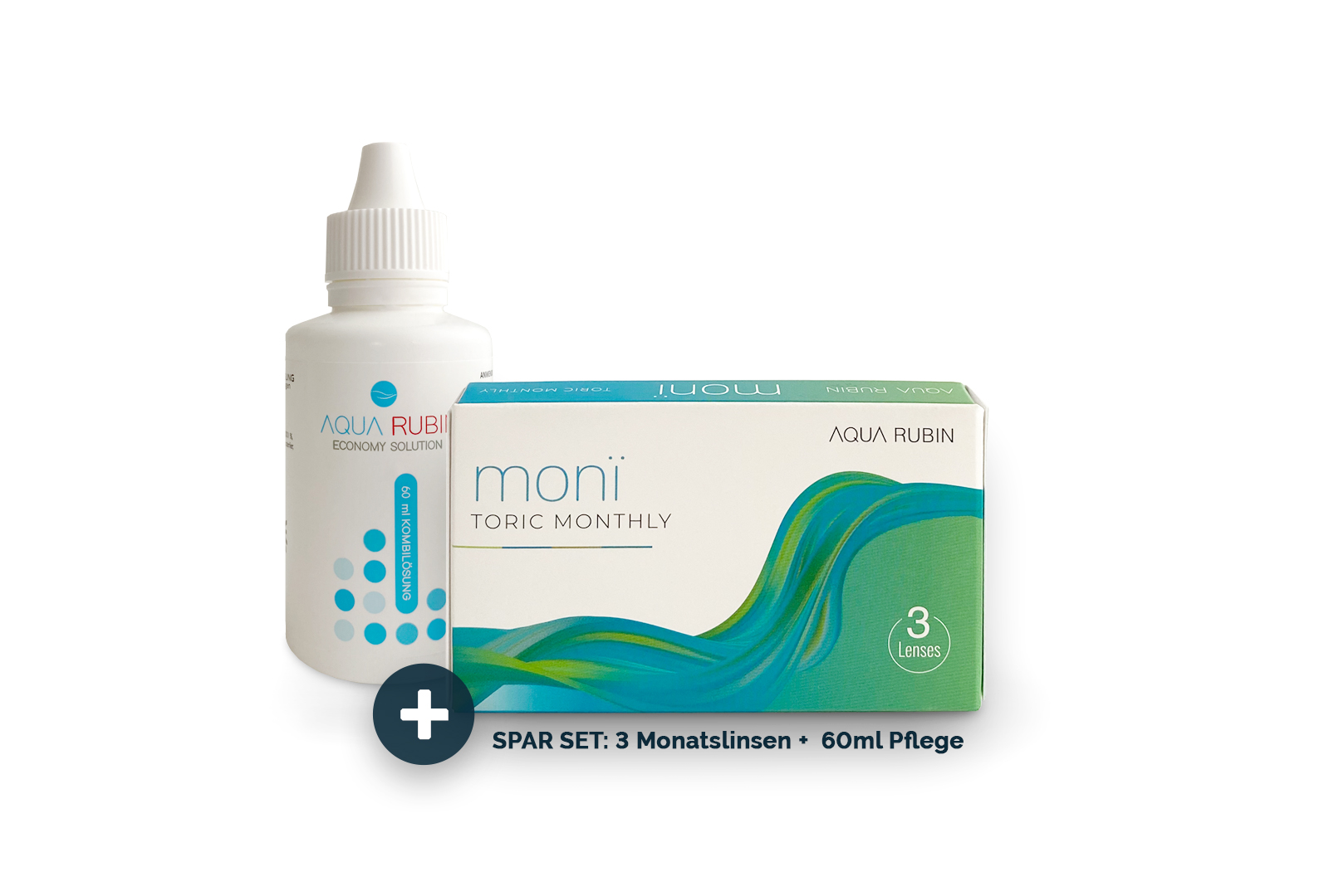 Inhalt: Aqua Rubin Moni toric (3 Stk.) + Aqua Rubin Kombilösung (60ml)